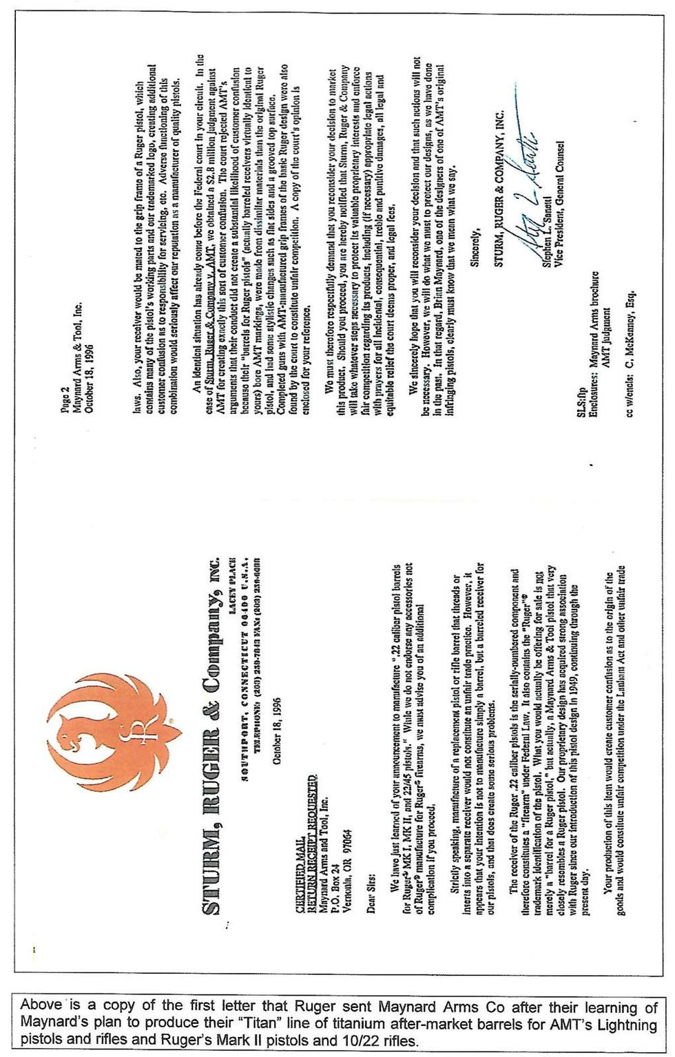 Upon completion and testing of the prototype barrels, Brian contacted Chuck Karwan, a gun scribe for Guns & Ammo who happened to live in So Oregon. At the same time, Brian announced his new project in Gun Test magazine. As Chuck was preparing to put the barrels through the test, Brian received a letter from Stephen Sanetti, VP and General Councel for Ruger, insisting he cease and desist on the project immediately, claiming unfair trade practices. Brian called and spoke to Mr Sanetti, requesting some sort of arrangement where Brian could compensate Ruger in turn for allowing Brian to continue. Soon thereafter Brian received a second letter denying his request. This was unfortunate and the project was scrubbed due to the fact that Maynard Arms Co was no match for Ruger’s legal team. To date, no one else has tried to do this.